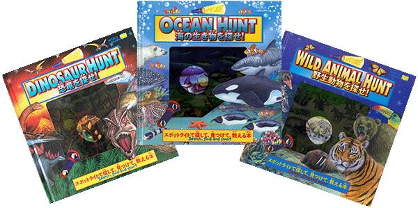 絵本に付属している紙製懐中電灯のスポットライトを動かすことで、探して、見つけて、数えてと大いに子供の探究心、好奇心を育みます。