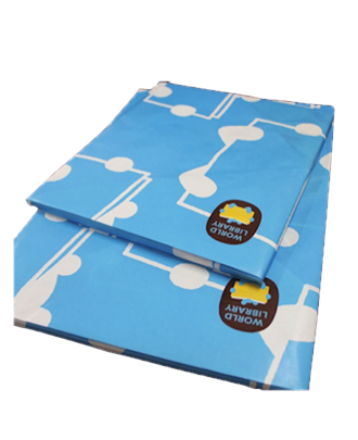 ワールドライブラリーのロゴを散りばめた包装紙でプレゼント包装いたします。
