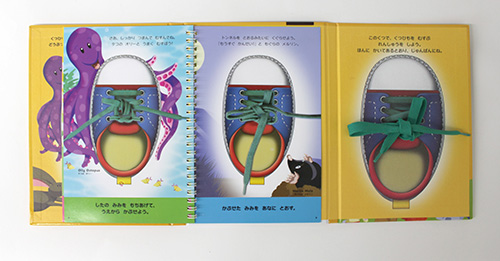 絵本を開くと、実物の靴ひもが取りつけてあります。1ステップずつ、結び方を動物たちがていねいに説明。読み進めいくうちに、いつの間にか、蝶々結びができるようになっているかも!