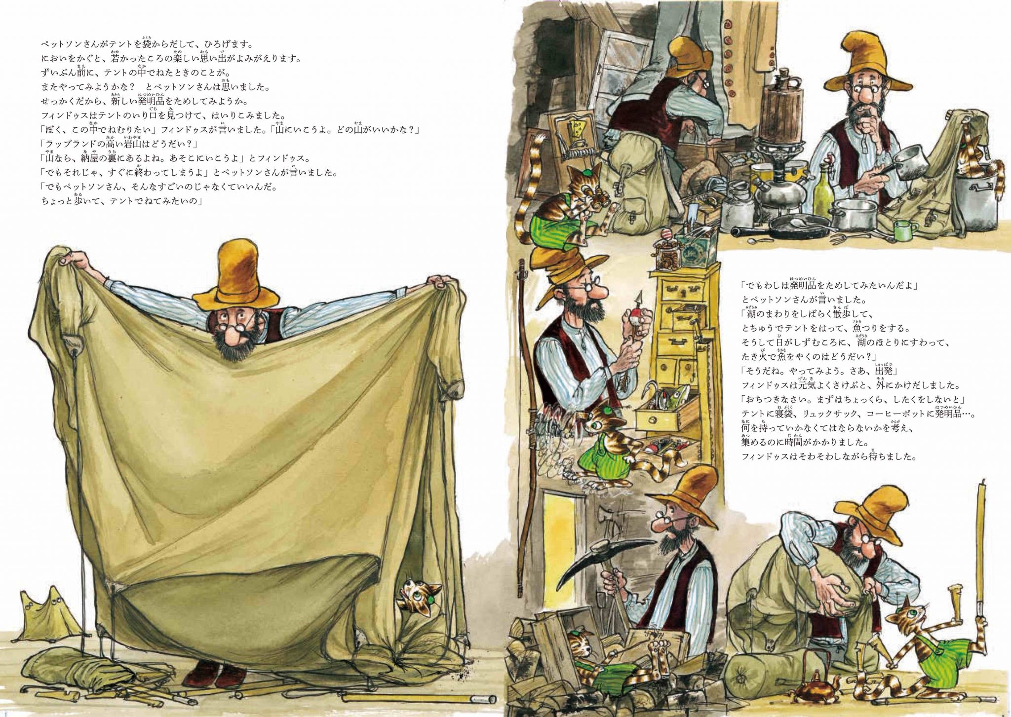 「フィンドゥスの誕生日」のペットソンさんとネコのフィンドゥスが、キャンプにでかけることになりました。ところが、めんどりたちも一緒に行きたいと大さわぎに…さて、今回はいったいどんな冒険がまっているのでしょう?