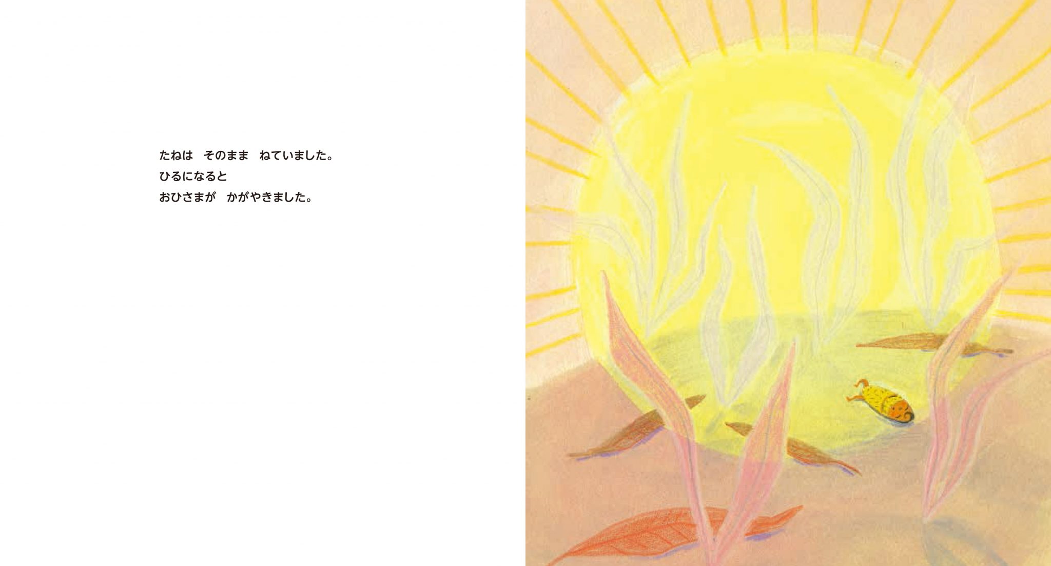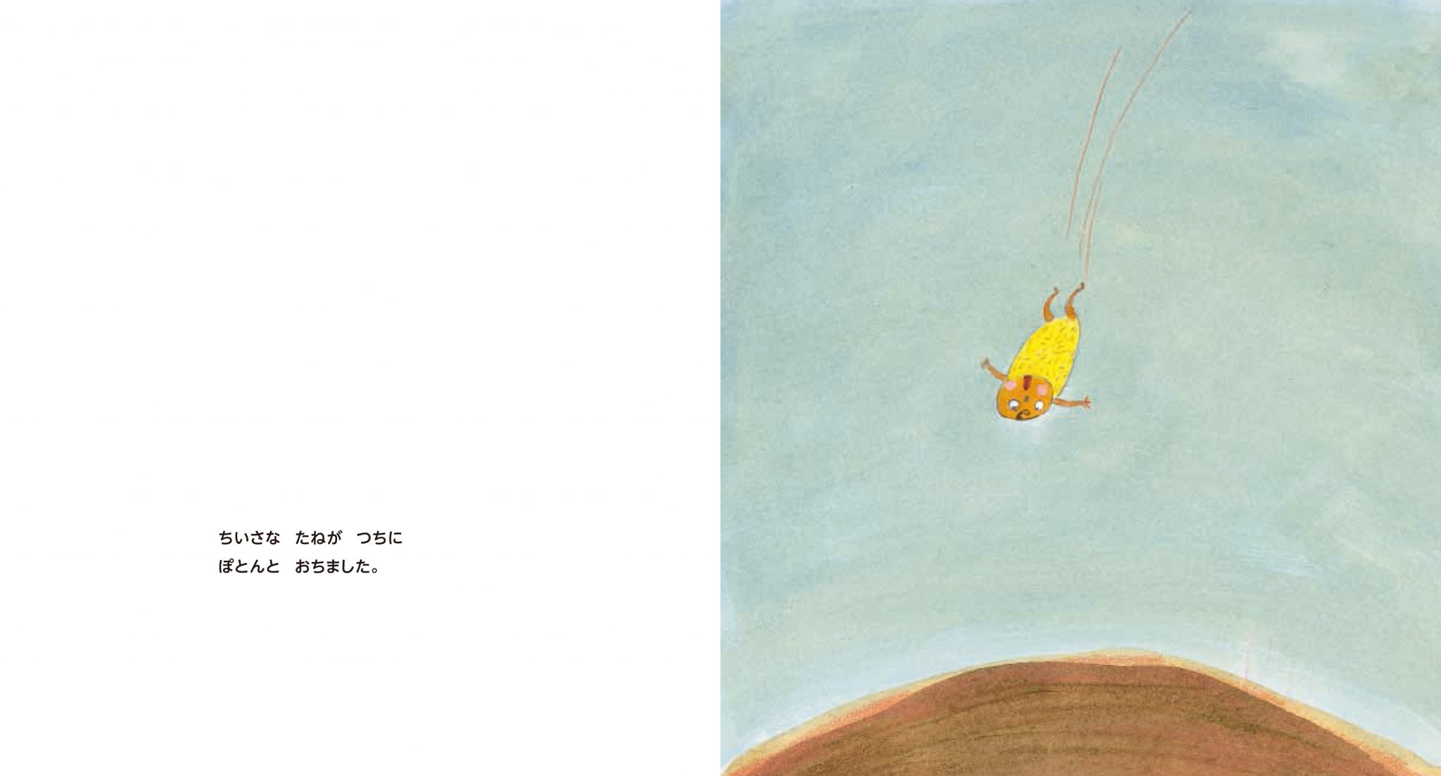 種は土の上に寝ているだけで、なにもできません。「きみは おおきくなったら なにに なるんだい?」とミミズが聞きました。でも、種にはわかりません。太陽や雨をあびて、やがて種はなにになるのでしょうか?