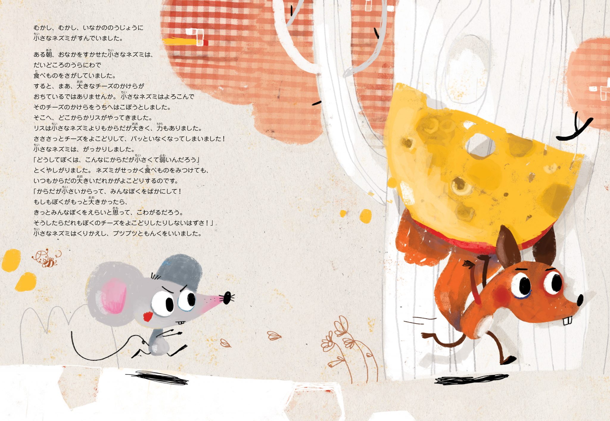 小さなネズミは、いつもくやしい思いをしてばかり。大きなカメの姿に感心していると、次々にもっと大きな動物を紹介され、ついにゾウにたどりつきます。そのゾウを簡単におどらせるのは、いったいだあれ? なんとネズミよりもずっとずっと小さな生き物でした。賢さと勇気があれば、体が小さくても力が弱くても大丈夫。ネズミは思い切ってチーズを取り返し、自信も取り戻すのでした。