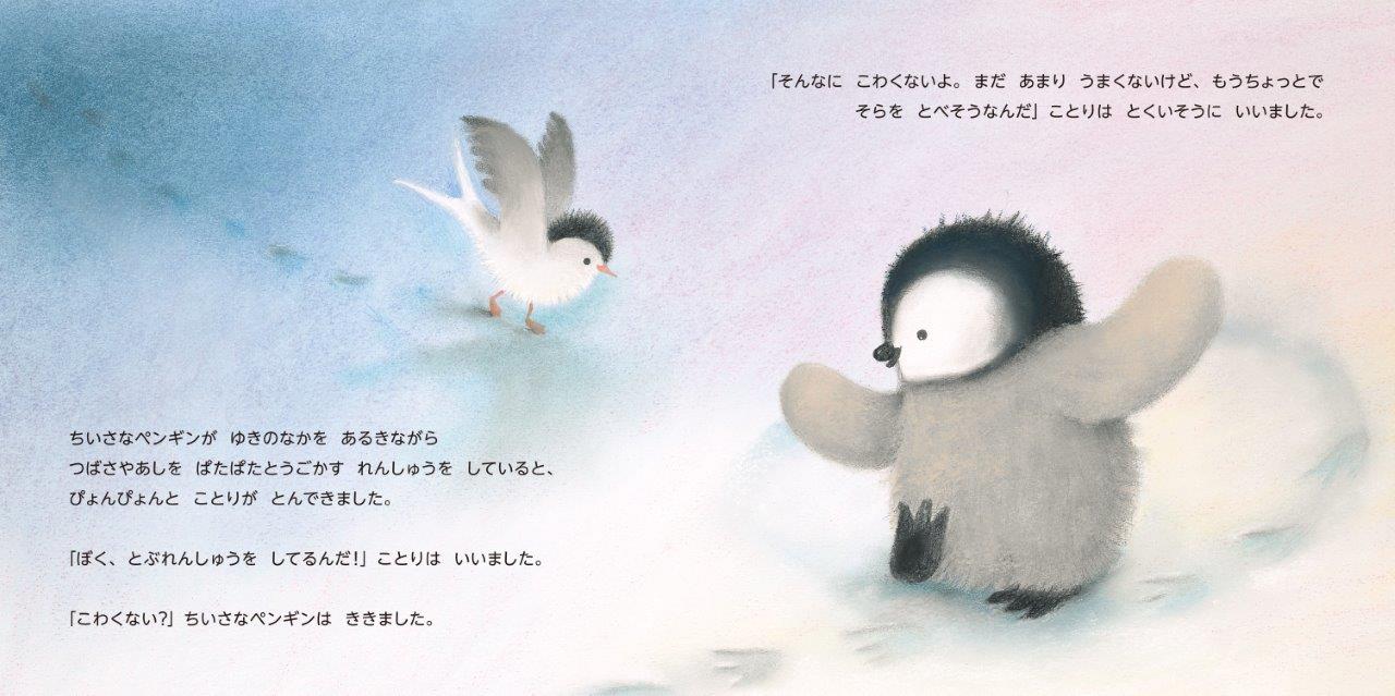 ちいさなペンギンは、泳げるようになりたくて、海に向かいます。つばさをぱたぱた動かしてみたり、足で水をける練習をしてみたりしながら、よちよちと海へ行く途中で、極北の地に暮らすさまざまな仲間たちに出会います。みんなそれぞれ、飛ぶことや魚をつかまえることなど、これまでできなかったことに挑戦しているのです。海に入るのがこわかったちいさなペンギンは…。