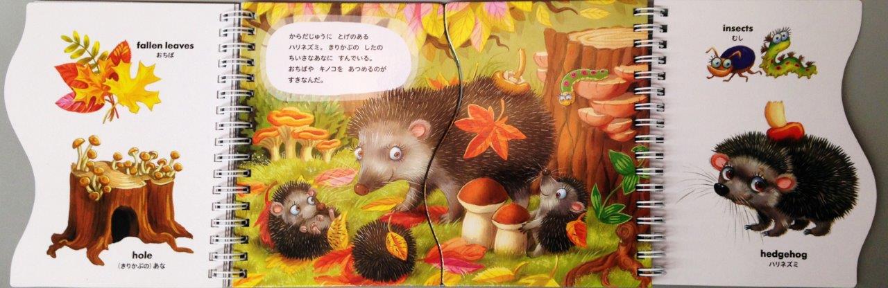 森にはいろいろな生き物がいます。可愛らしい動物の親子と、森の植物などを描いたカードが左右に分かれて綴じられている、パズル式の絵本です。親子が並んだ絵になるように、右ページと左ページの絵をめくって揃えてみましょう!イラストに添えた動物や植物の名称は、英語と日本語のバイリンガル表記です。絵合わせを楽しみながら、身近な単語が覚えられるかもしれませんね。分割されたボードタイプのカードが、左右でダブルリング綴じになっています。