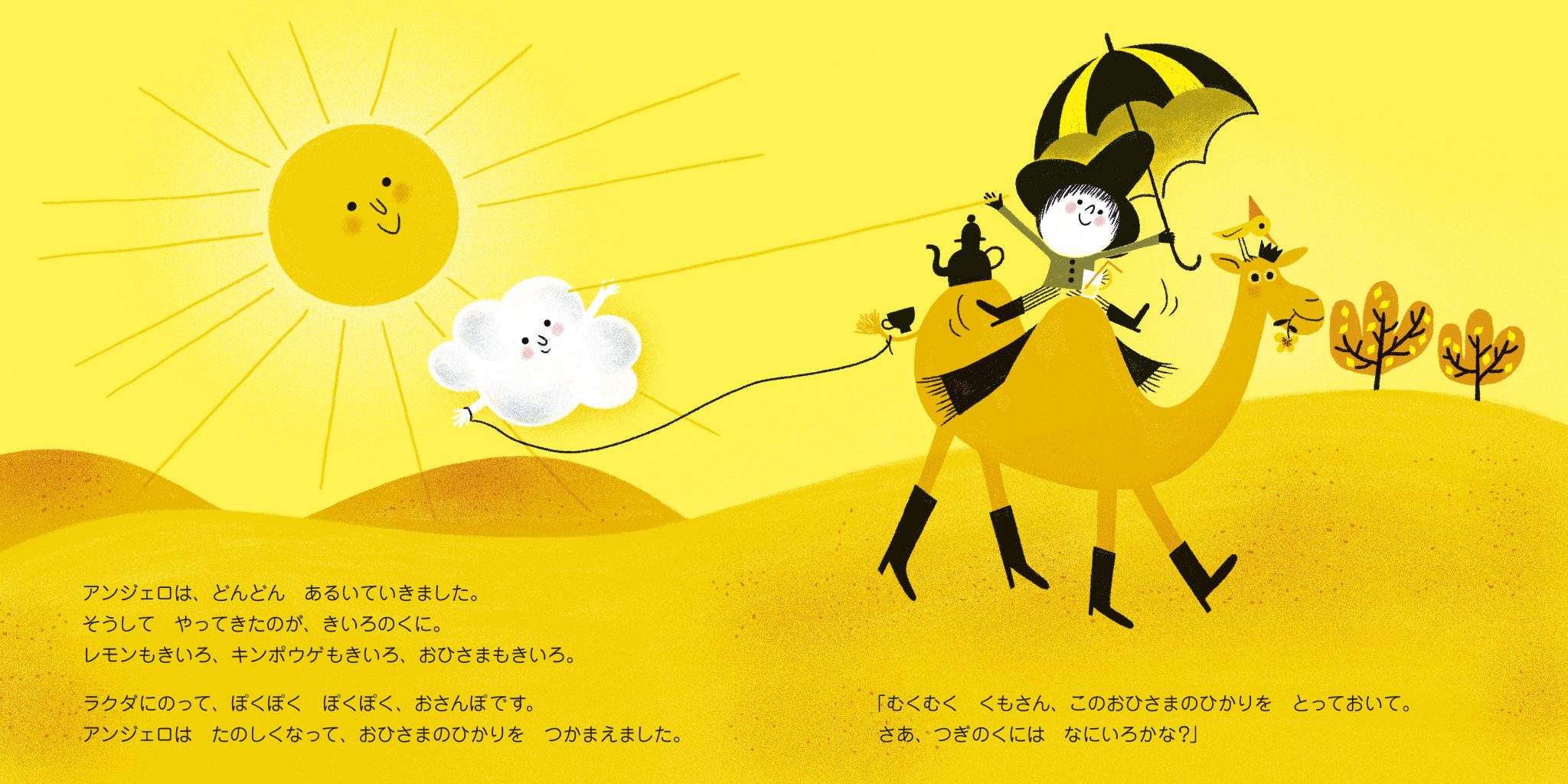 まっしろな雲の上で暮らしている、ちょっとかわった男の子、アンジェロ。下の世界にはどんな色があるのか知りたくなって、雲を連れてでかけます。きいろの国、あかの国、あおの国…アンジェロは色を集めて国から国へ。