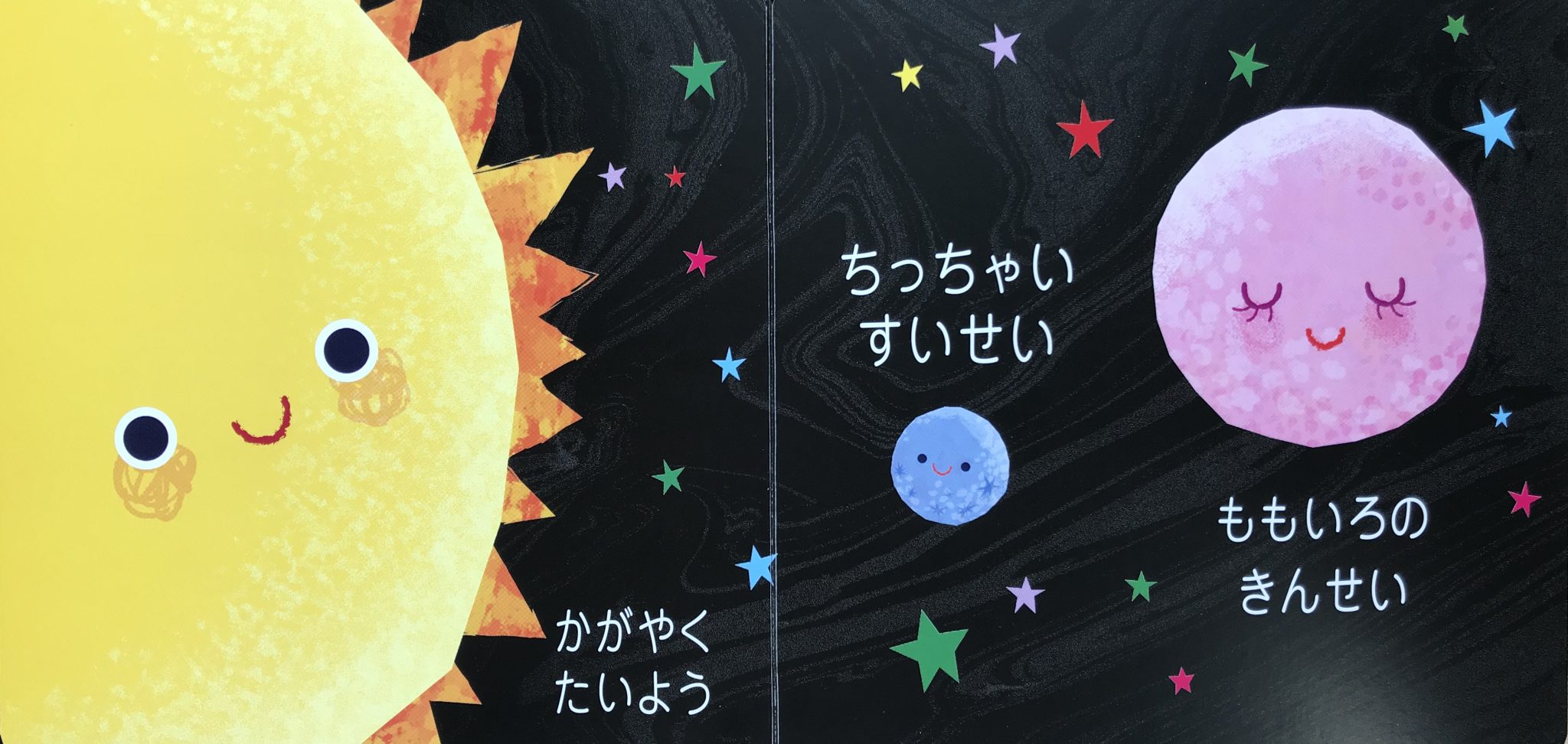 宇宙にはキラキラ光る星や、色あざやかな惑星がいっぱい。さあ、大きく絵本をひろげて、いっしょにロケットでとびたとう。