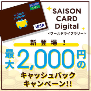 このたび、SAISON CARD Digital<ワールドライブラリー>にご入会のお客様は、ご入会からキャッシュバック対象期間中にご利用された利用金額について、セゾンカードより、100%キャッシュバックされます!(最大2,000円)