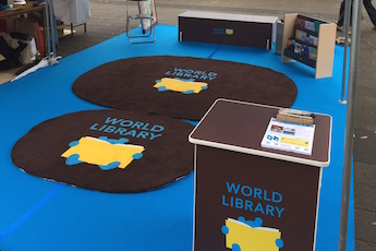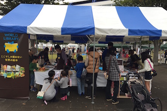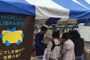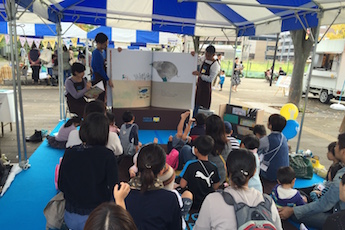 当日は企業などが提供する8つの学び体験に親子で挑戦。ワールドライブラリーは①巨大絵本「ちぐはぐソックス」の読み聞かせ ②絵本ライブラリースペースの提供 ③絵本を特別価格にて販売 を実施しました。
