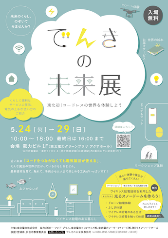 このたび、東北電力株式会社が仙台市で開催する「でんきの未来展」は、電気の新しい技術であるワイヤレス給電を見て、触れて、子供から大人まで誰でも無料で楽しめるイベントです。地域に住む方々が快適・安全・安心に暮らすことができるスマート社会実現に向けて、未来の暮らしをのぞいていただくことができます。