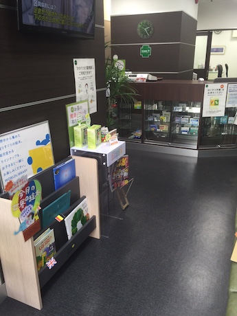 カラフルな気球のポップを自社で作成し、「心ゆたかな人生を!」とかいて、「今月の世界の絵本」と目立つように作りました。気球にのっていろんな絵本の世界に旅するような彩りある人生を提案できるように思いを込めました。薬局の待合室は小さな舞台ですが、しっかり演出して病める方の心にやさしく明るく照らす存在に育てていくつもりです。