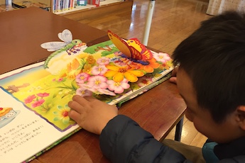 『ベッシーのすてきなキャンディ』のポップアップ絵本は、どうなっているのかなぁ?と色々な角度からのぞいたり、矢印を左右につまんで絵を動かしてみたり…笑いながら楽しい時間を過ごしました。