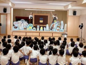 「柏の葉こども園」では、事前に全クラスで同絵本を読んでくれていたので、子どもたちの興味も深く、シリーズのキャラクターの名前も知っている子どもたちは、MCとの掛け合いも楽しそうな様子でした。