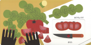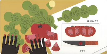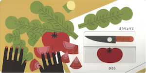 『サラダ』は、簡単な単語のみで、絵本の中で一緒にサラダを作ります。