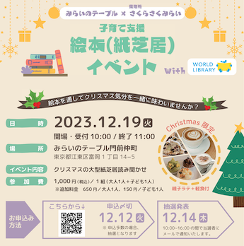このたび、12月19日(火)、さくらさくプラスグループが運営する東京・江東区の子育て支援カフェ「みらいのテーブル門前仲町」にて、大型紙芝居の読み聞かせイベントが行われます。