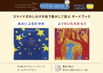 ワールドライブラリーの大人気しかけ絵本ちいさなゆびでシリーズ『あおいよるのゆめ』『ようせいたちのもり』は、本国イタリアを含め、『あおいよるのゆめ』は世界13カ国で翻訳、『ようせいたちのもり』は世界6カ国で翻訳出版されています。
