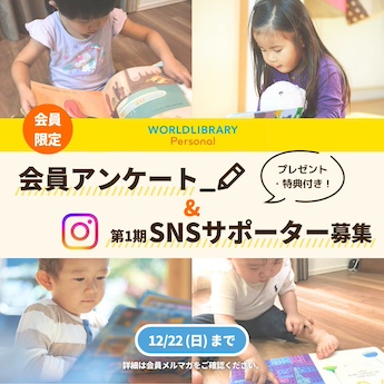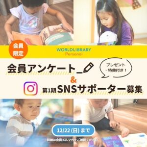 ワールドライブラリーパーソナルをお友だちにお勧めしてみたい方、毎月届く絵本の魅力やお子さまのご様子を魅力的に発信していただける方、ぜひ、この機会に回答またはご応募ください!