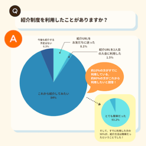また、お友だち、家族等にお薦めしたことがある会員さまは約65%で、実際に、紹介制度を利用した会員さまは約10%にとどまっていました。