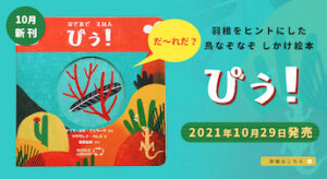 『ぴぅ!』は、3〜4歳児向けのしかけ絵本。チリからお届けする かわいい! たのしい! なぞなぞしかけ絵本の登場です!『ぴぅ!』は鳥の鳴き声。羽根をヒントに 「だーれだ?」 とページをめくると、スライド式にイラストが変形して、魔法のように答えを教えてくれます。ポップでカラフルな配色、キュートなイラストで描かれたペンギン、フクロウ、フラミンゴなど7羽の鳥が出てきます。