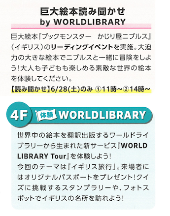 ワールドライブラリーは6月28日(土)に、巨大絵本の読み聞かせの他、クイズ、スタンプラリーが楽しめる「ワールドライブラリーツアー」を実施します!ご参加いただいたお子さんには素敵なプレゼントをご用意していますので、ぜひ会場までお越しください。予約等は不要となっております。