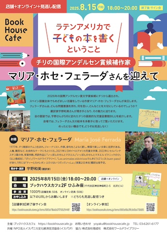 ワールドライブラリーは東京・神保町にある有名絵本専門店ブックハウスカフェが主催するイベント「ラテンアメリカで子どもの本を書くということ~チリの国際アンデルセン賞候補作家 マリア・ホセ・フェラーダさんを迎えて~」に協力します。