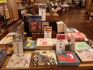店頭では、その国についての絵本ではなく、その国で読まれている、生まれた絵本を国別に展開しています。ワールドライブラリーの絵本の他にも、国旗や国についての本が置かれており、お子さんにも分かりやすく並べられています。