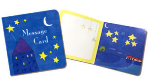 今回、オンラインショップ購入先着100名様への特典として、『あおいよるのゆめ』特製メッセージカードをお付けします。特製メッセージカードは、『あおいよるのゆめ』の絵本の世界観をそのままに、何にでも使うことができる大人使いにもピッタリなおしゃれなカードです。